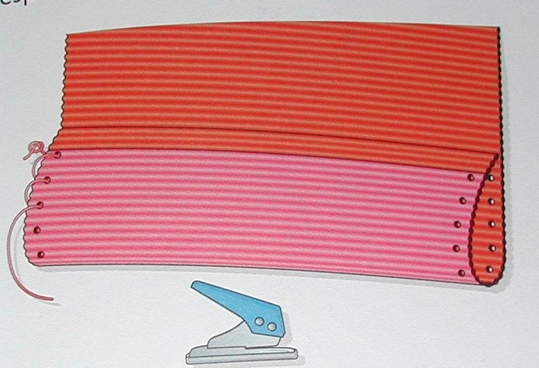 1- Pegar por el dorso dos láminas de 50x70 cm. de cartón ondulado de colores diferentes, desplazarlas de manera que una quede 2 cm.más arriba que la otra. Plegar el trozo que sobresale y pegarlo sobre la otra lámina. Dejarlo secar. A cada lado , hacer una marca a unos 18 cm. del lado inferior