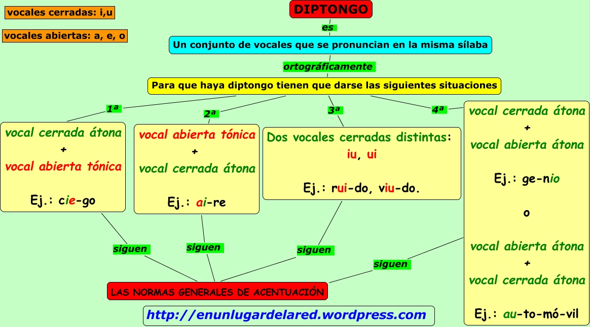 - Diptongo: es la unión de dos vocales en una misma sílaba (puen-te).